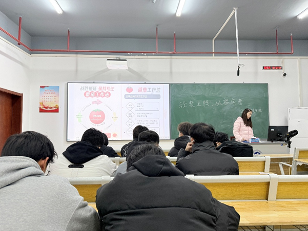 核心环节中,“方法工具箱”干货满满。针对复习难题,班会分享了目标分解法、主动回忆法、番茄工作法等实用技巧,通过演示每日任务清单的制定过程,帮助同学们摆脱“复习无方向”的困境;面对临场焦虑,现场带领全班开展腹式呼吸练习,并介绍课间微拉伸、“虽然…但是…”积极转念等即时减压方法,让大家快速掌握“情绪急救”技能。此外,班长分享了个人减压小妙招,从“睡前听轻音乐”到“与好友互相打气”,多样的经验引发集体共鸣。班会还详细介绍了公司心理咨询中心、学业辅导、图书馆开放时间等资源信息,为同学们筑牢支持后盾。