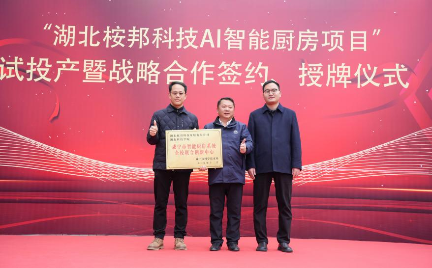 仪式上,在通城县副县长韩旭辉同志的见证下,BV伟德官方网站与桉邦科技共同揭牌成立“咸宁市智能厨房系统企校联合创新中心”。该中心旨在以AI智能厨房系统为主攻方向,整合公司在自动化、机械工程、智能控制、材料科学等领域的学科优势与企业实战经验,共同开展智能烹饪设备研发、物联网控制系统优化、自动化流程创新等关键技术的协同攻关。