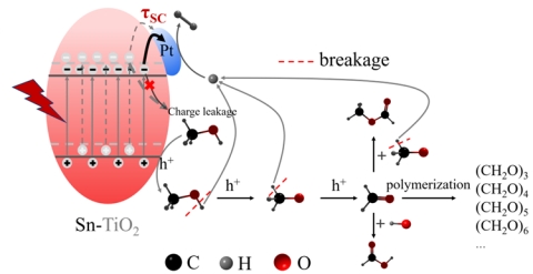 通过系统调控光强、波长和温度研究显示提升光强可使τSC降低1.33倍,短波长光照虽穿透性差但τSC缩短2.41倍,温度升至50°CτSC下降3.51(图2同时,Sn掺杂有效抑制升温带来的电荷泄漏加剧问题,优化后的Pt/3% Sn-TiO230 W紫外光(254 nm)、80°C条件下,氢气产率达82.86 mmolg−1h−1,甲醛产率84.13 mmolg−1h−1,表观量子效率(AQY)达40.02%各项性能在现有文献报道中处于领先地位